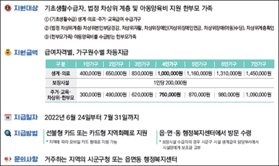 - 생계, 의료 1인 기준 40만원은 2021년 1분위 가구의 평균 소비 지출액을 기준으로 생활물가 지수 인상에 따른 부담액 고려